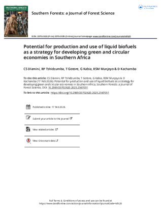 CS Dlamini, RP Tshidzumba, T Gotore, G Kabia, RSM Munjoyo & D Kachamba (17 Feb 2026): Potential for production and use of liquid biofuels as a strategy for developing green and circular economies in Southern Africa, Southern Forests: a Journal of Forest Science, DOI: 10.2989/20702620.2025.2567051